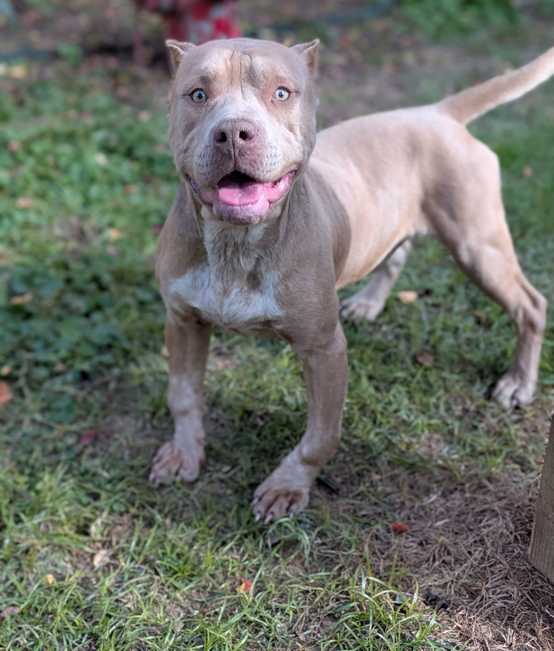 Goliath is a 3-year-old pit mix that weighs about 50 pounds and loves everyone. He is a total weenie and nervous in new situations, so he will need some patience and help with his confidence.
