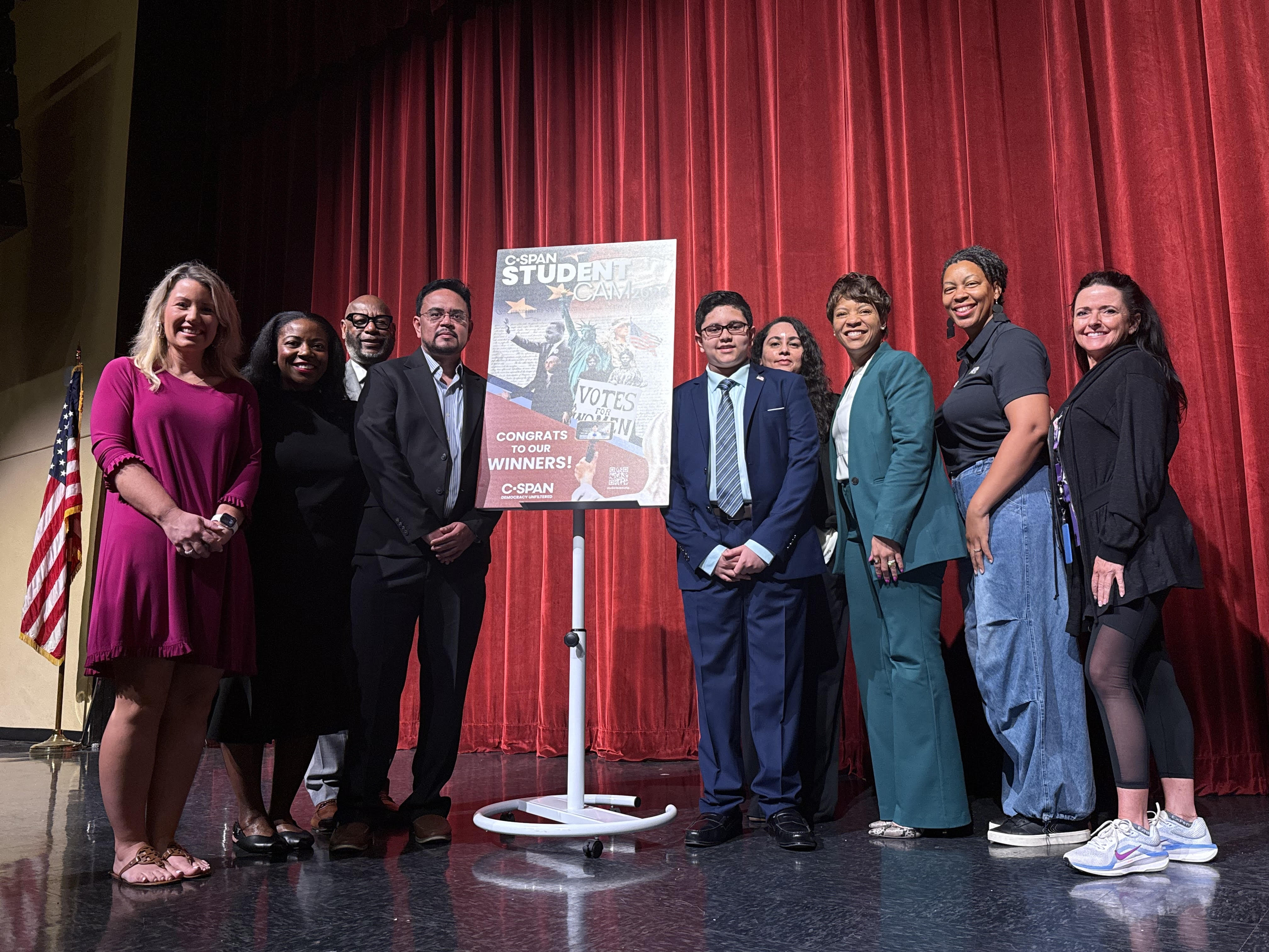 A C-SPAN and Spectrum representatives joined classmates, teachers, family members and community leaders to present the awards and recognize students and their teachers who served as their StudentCam advisers, at school assemblies.